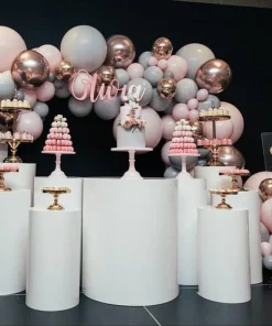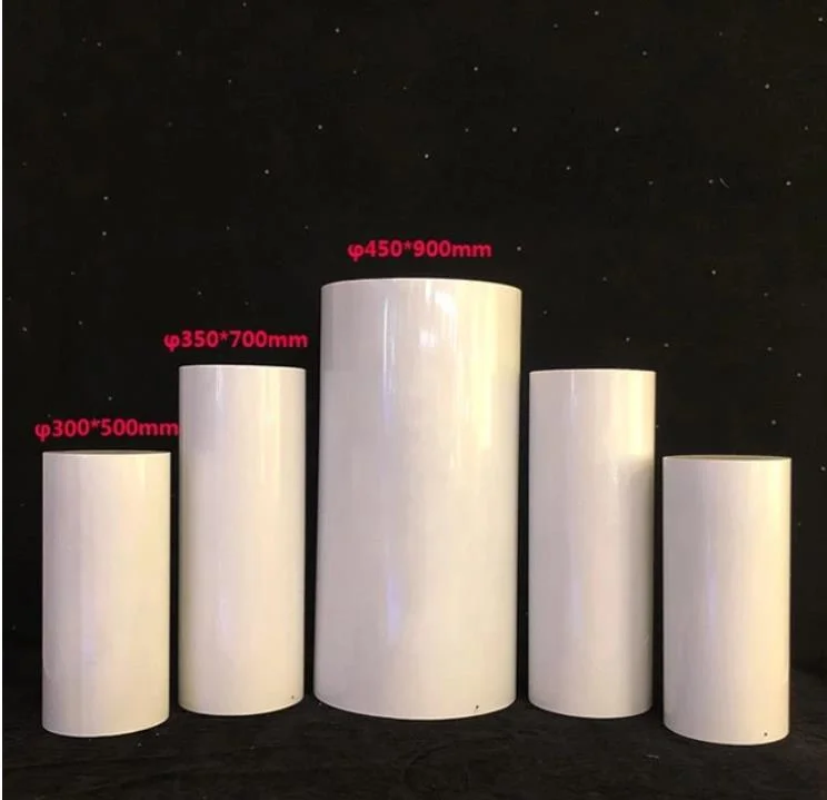 Noleggio cinque alzate-cilindri in plexiglass bianco lucido, di differenti misure. Le strutture in plexiglass possono essere utilizzate per allestire confettate o sweet table.